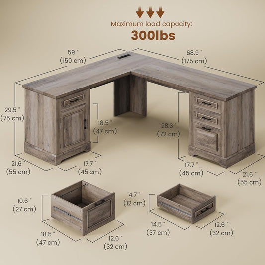 • Farmhouse L Shaped Desk, Executive Computer Desk with Drawers and Storage Cabinet, Home Office Desk with File Drawer and Power Outlet, Corner Desk, Workstation for Office Home, Grey