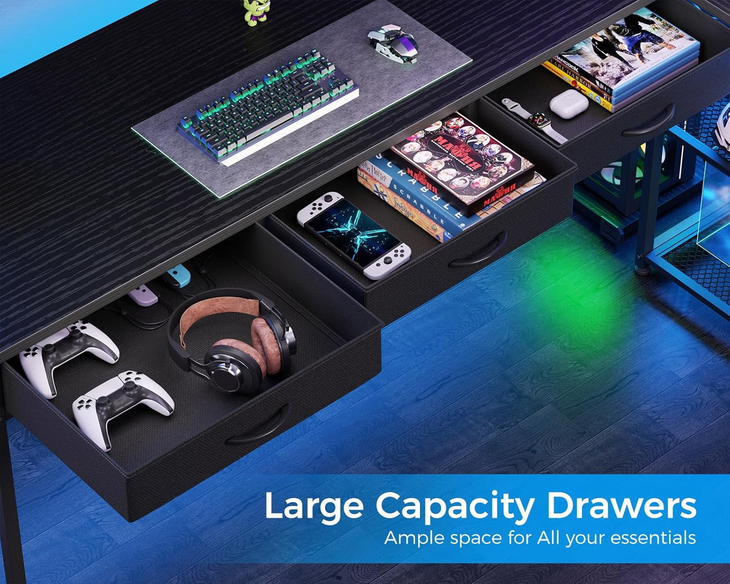 53 Inch L Shaped Computer Desk with Drawers, Corner Desk with Power Outlets & Reversible Storage Shelves, Movable CPU Stand for Home Office Gaming, Black