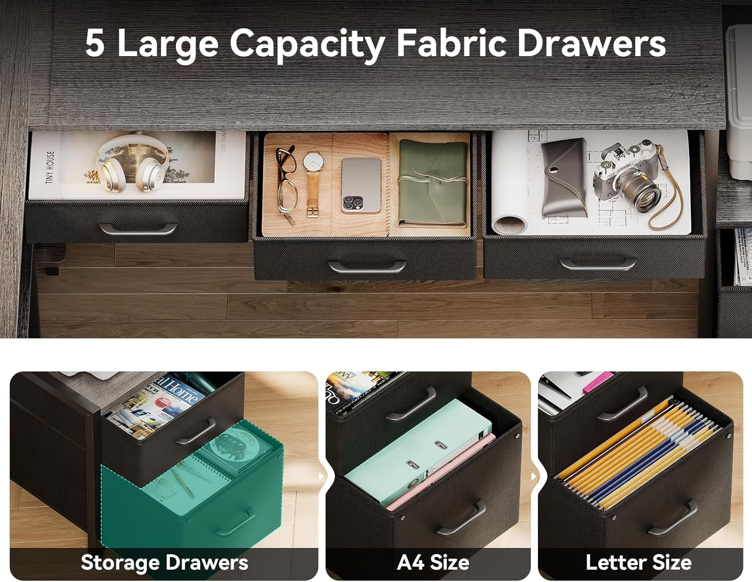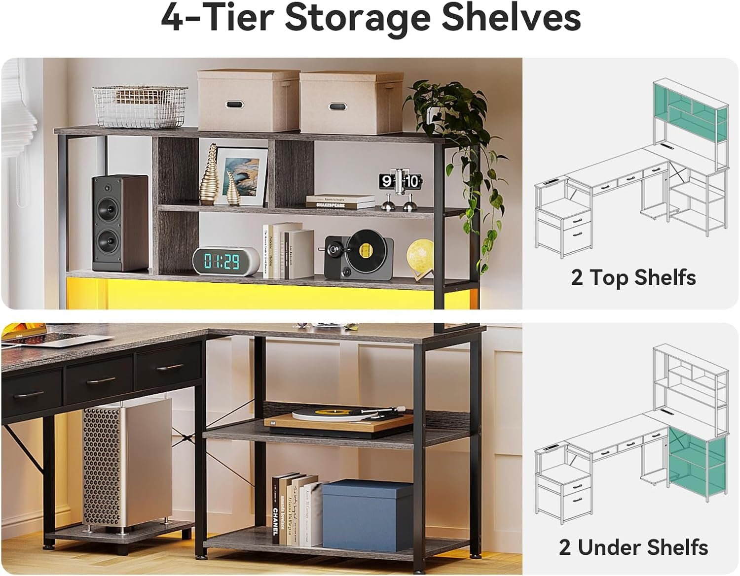 79 Inch L Shaped Desk with File Drawers, Reversible L Shaped Gaming Desk with Power Outlets & LED Lights, Computer Desk with Storage Shelves for Home Office, Grey Oak